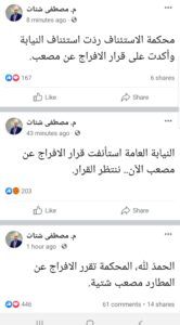 ولاحقا قال: “النيابة العامة استأنفت قرار الافراج عن مصعب الآن.. ننتظر القرار”.