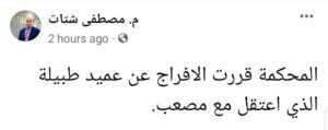 وكان المحامي مصطفى شتات قال على صفحته على فيس بوك: “المحكمة تقرر الإفراج عن المطارد عميد طبيلة الذي اعتقلته الأجهزة الأمنية برفقة المطارد مصعب اشتية في نابلس”.