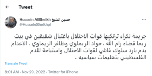 جريمة نكراء ترتكبها قوات الاحتلال باغتيال شقيقين في بيت ريما قضاء رام الله ، جواد الريماوي وظافر الريماوي . الاعدام بدم بارد سلوك فاشي لقوات الاحتلال واستباحة للدم الفلسطيني بتعليمات سياسيه.”