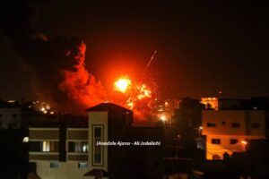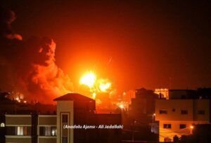 لحظة قصف طائرات الاحتلال الحربية لعدد من المواقع في قطاع غزة، فجر اليوم”.