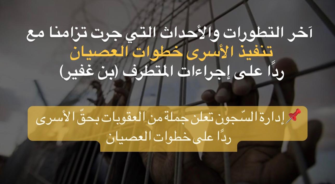 وكان الأسرى يوم أمس في سجن (نفحة) قد شرعوا بتنفيذ خطوات عصيان، وأقدمت إدارة السّجون على قطع المياه السّاخنة عنالأسرى في سجن (نفحة)، كما أقدم أحد السّجانين يوم أمس خلال ما يسمى (بالفحص الأمني) باستفزاز الأسرى، والتباهيبإجراءات (بن غفير)، الأمر الذي فرض حالة من التوتر في السّجن، ورد الأسرى بالتكبير في عدة أقسام.