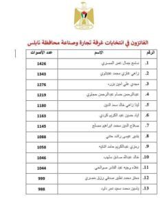 أعلنت اللجنة المركزية لإدارة انتخابات الغرف التجارية الصناعية، مساء اليوم السبت، أسماء الفائزين في انتخابات غرفة تجارة وصناعة محافظة نابلس.