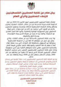 وأعلنت التصعيد حتى  تستجيب الحكومة لمطالب الصحفيين العادلة، الذين قدموا 55 شهيداً من زملائهم منذ عام 2000، وارتكب الاحتلال بحقهم أكثر من 8500 جريمة وانتهاك منذ عام 2013.