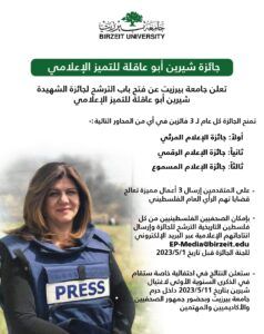 أعلنت جامعة بيرزيت عن فتح باب الترشح لجائزة الشهيدة شيرين أبو عاقلة للتميز الإعلامي، والتي أطلقتها الجامعة بعد استشهاد شيرين أبو عاقلة.