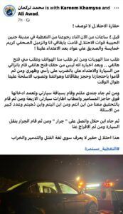 وأفاد محمد تركمان أحد الصحفيين اللذين تم الاعتداء عليهما، بأن قوات الاحتلال قامت باحتجازه مع زميله كريم خمايسة لعدة ساعات على الحاجز، بعد عودتهما من تغطية صحفية في جنين، واعتدت عليهما بالضرب، وأعطبت عجلات مركبته الخاصة.
