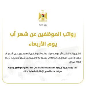 أعلنت وزارة المالية أن موعد صرف رواتب الموظفين العموميين عن شهر آب يوم غدًا الأربعاء الموافق 6/9/2023 بنسبة 90% من راتب شهر آب وبحد أدناه 2000 شيكل