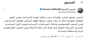 وقال أمين سر اللجنة التنفيذية لمنظمة التحرير الفلسطينية حسين الشيخ، “الرئيس محمود عباس والقيادة يرحبون باتفاق الهدنة الإنسانية، ويثمنون الجهد القطري المصري الذي تم بذله، ونجدد الدعوة إلى الوقف الشامل للعدوان الإسرائيلي على الشعب الفلسطيني، وإدخال المساعدات الإنسانية، وتنفيذ الحل السياسي المستند إلى الشرعية الدولية والذي يؤدي إلى إنهاء الاحتلال ونيل الشعب الفلسطيني حريته واستقلاله وسيادته”.