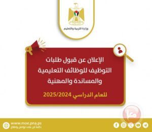 ودعت “التربية” الراغبين في تقديم الطلبات لهذه الوظائف إلى زيارة البوابة الإلكترونية لديوان الموظفين العام  www.gpc.pna.ps  للتعرف إلى متطلبات التوظيف من خلال موقع الوزارة https://moe.edu.ps/c/30097%20.