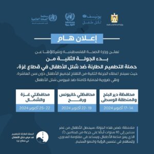 أعلن وزير الصحة الفلسطيني د. ماجد أبو رمضان انطلاق الجولة الثانية من حملة التطعيم ضد شلل الأطفال في قطاع غزة، يوم غدٍ الاثنين، وذلك للأطفال دون سن العاشرة.