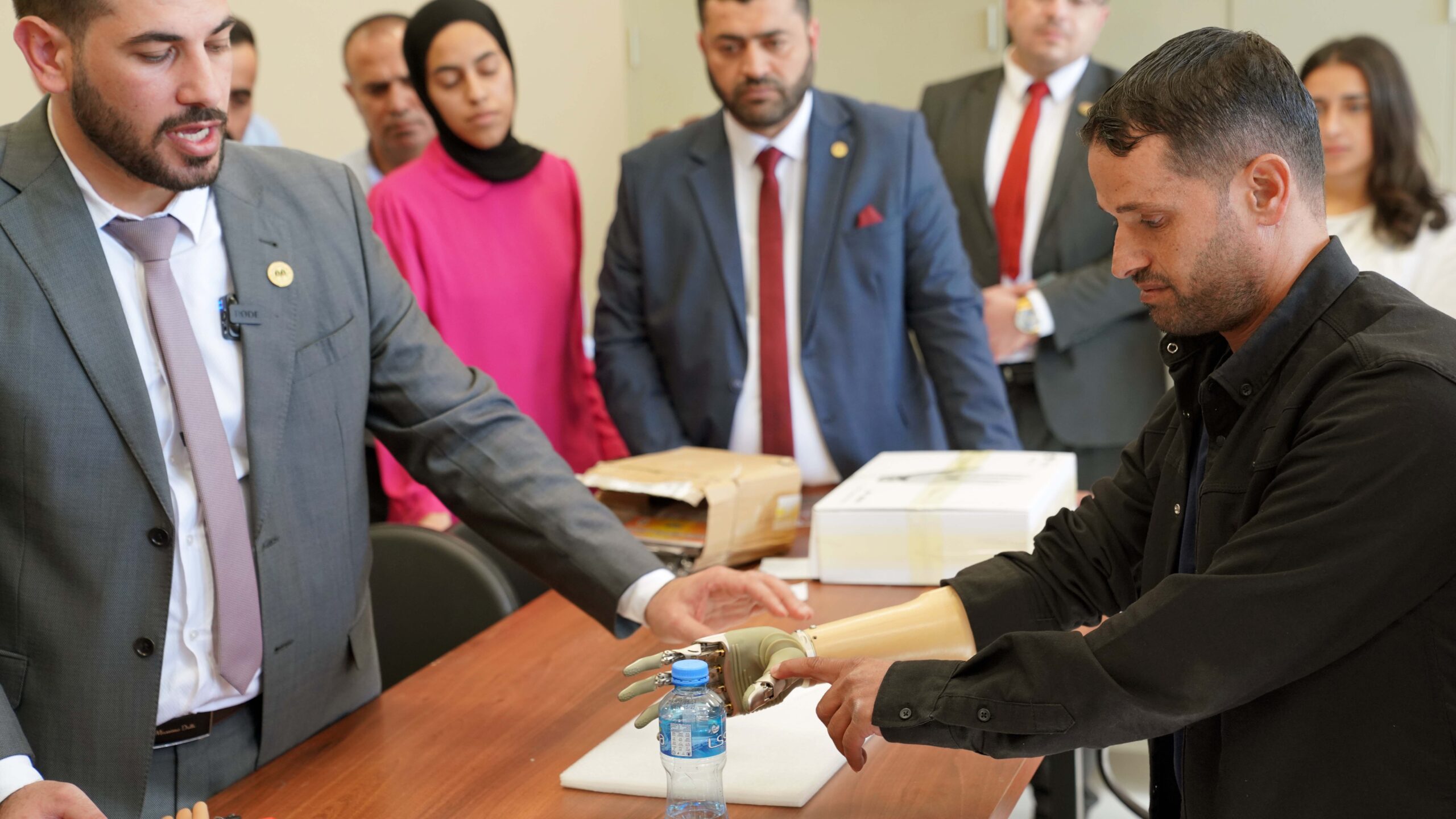 بحضور القائم بأعمال رئيس الجامعة الدكتور براء عصفور، ونائب رئيس الجامعة لشؤون حرم رام الله الأستاذ الدكتور محمد آسيا، ومدير عام مصنع الأطراف الصناعية في الجامعة المهندس مصطفى ارشيد، والمدير الفني لمصنع الأطراف الصناعية في الجامعة الأستاذ وليد أبو سمرة، وكان في إدارة المؤتمر الصحفي مدير العلاقات العامة الأستاذ فراس الصيفي.