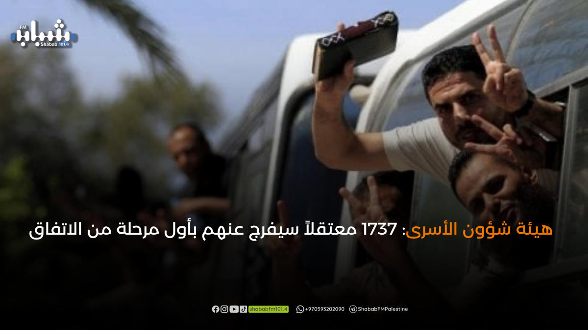 قال رئيس هيئة شؤون الأسرى والمحررين الفلسطينية، قدورة فارس، إن 1737 معتقلاً فلسطينيًا سيتم الإفراج عنهم ضمن المرحلة الأولى من اتفاق تبادل الأسرى ووقف إطلاق النار في قطاع غزة.