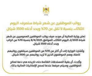 أعلنت وزارة المالية، أنه سيتم صرف رواتب الموظفين العموميين عن شهر شباط الماضي، اليوم الثلاثاء، بنسبة لا تقل عن 70%، وبحد أدناه 3500 شيقل.
