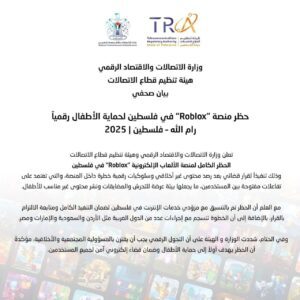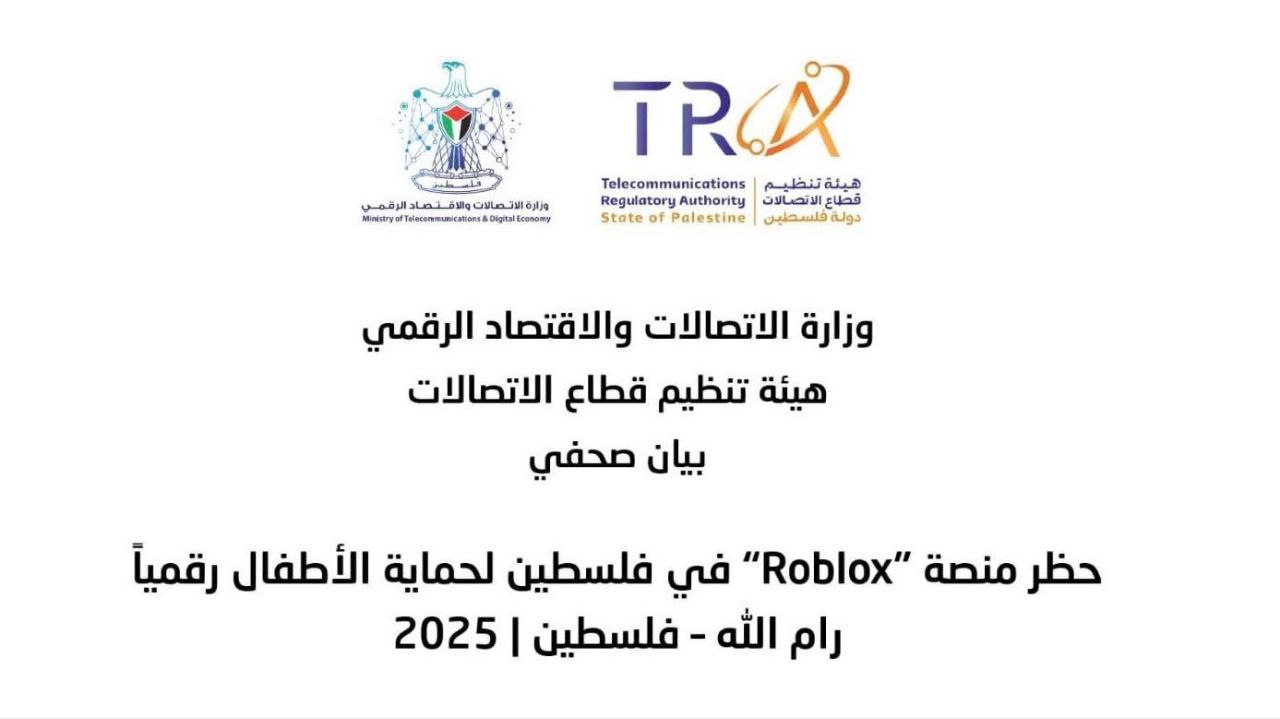 أعلنت وزارة الاتصالات والاقتصاد الرقمي وهيئة تنظيم قطاع الاتصالات حظر منصة الألعاب الإلكترونية “Roblox” بشكل كامل في فلسطين، وذلك تنفيذاً لقرار قضائي، بعد رصد محتوى غير أخلاقي وسلوكيات رقمية خطيرة داخل المنصة- التي تعتمد على تفاعلات مفتوحة بين المستخدمين- ما يجعلها بيئة للتحرش والمضايقات ونشر محتوى غير مناسب للأطفال.