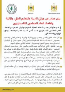 أصدرت وزارتا التربية والتعليم العالي والمالية والاتحاد العام للمعلمين الفلسطيني بيانا توضيحيا حول ما واكب مشهد انتظام العملية التعليمية، والبيان الصادر عن الاتحاد مساء أمس السبت، على النحو التالي: