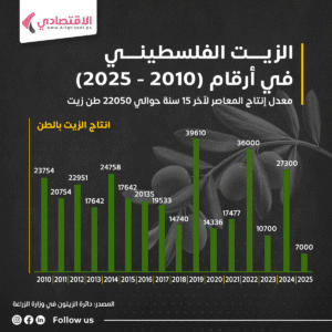 وبحسب الورقة المقدمة، بلغ متوسط إنتاج الزيت خلال آخر 15 سنة نحو 22,050 طن فقط، ما يعكس انخفاضاً واضحاً في القدرة الإنتاجية التي لطالما تميّزت بها شجرة الزيتون الفلسطينية.