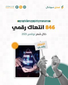 رصد مركز صدى سوشال، خلال شهر نوفمبر 2025؛ 846 انتهاكًا رقميًا، وجاءت غالبية الانتهاكات عبر منصات تيليغرام بـ 381 انتهاكًا الذي تفرد بانتهاكات التحريض والتشهير بشكل خاص، ومنصات ميتا بـ 208 انتهاكات، وإكس (تويتر سابقًا) بـ 231 انتهاكًا رقميًا.