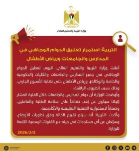 وأكدت “التربية” أنه سيتم تقييم الحالة وفق تطورات الأوضاع، وسيُعلن عن أي مستجدات في حينه عبر القنوات الرسمية التابعة للوزارة.