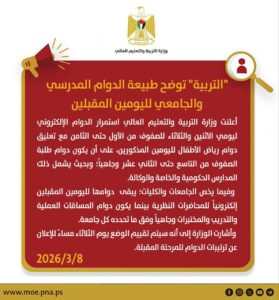 وفيما يخص الجامعات والكليات؛ يبقى دوامها لليومين المقبلين إلكترونياً للمحاضرات النظرية بينما يكون دوام المساقات العملية والتدريب والمختبرات وجاهياً وفق ما تحدده كل جامعة.