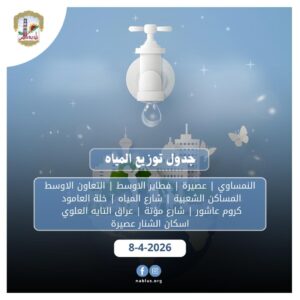 جدول توزيع المياه على مدينة نابلس لليوم الأربعاء 8-4-2026