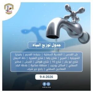 جدول توزيع المياه على مدينة نابلس لليوم الخميس 9-4-2026