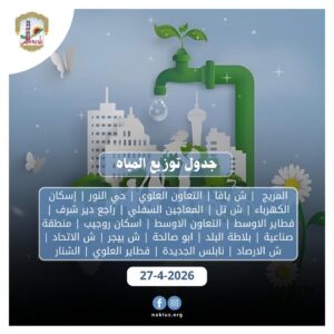 جدول توزيع المياه على مدينة نابلس لليوم الإثنين 27-4-2026